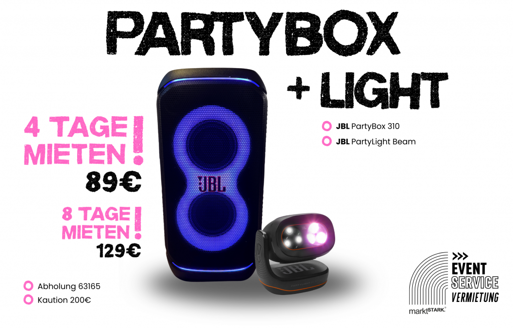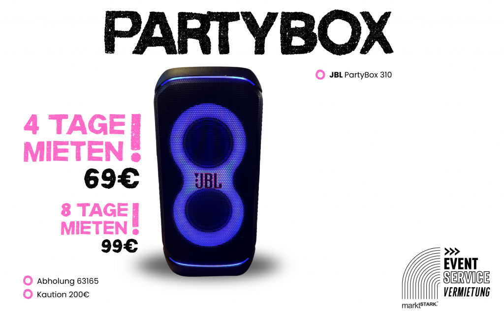 Partybox, Musikbox von JBL Modell JBL PartyBox 320 mieten für Ihr Event! Einfacher Transport im PKW möglich. Perfekt für Geburtstage, Hochzeiten oder Firmenfeiern. Unsere Vermietung bietet hochwertiges Equipment, das Ihre Veranstaltung zum Highlight macht. Abholung ist in Mühlheim am Main möglich – in der Nähe von Frankfurt, Offenbach, Hanau und Obertshausen. Jetzt das passende Zelt mieten und Ihre Feier unvergesslich gestalten!